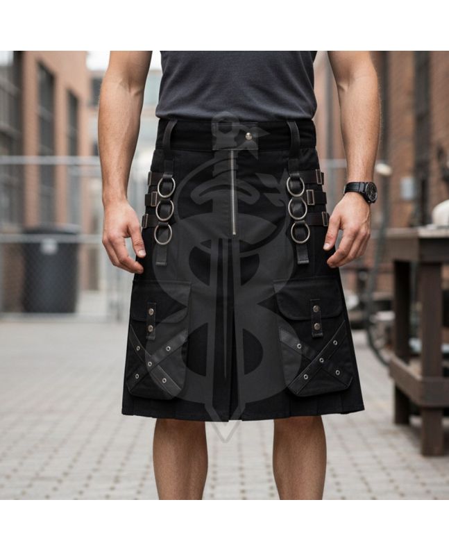 Utility Black Cotton Gothic Kilt Cargo Pockets
